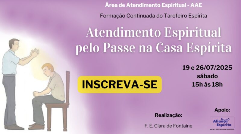 Read MoreREALIZAÇÃO:Área de Atendimento Espiritual (AAE) da AME/BH – 10º CRE PÚBLICO-ALVO:Dirigentes de casa espirita, coordenadores e tarefeiros da atividade do passe na casa espirita. DATA/HORÁRIO:27/7/2024 – 15h