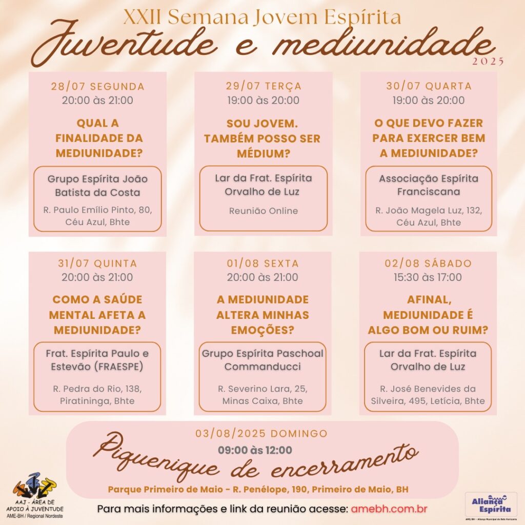 | 01/08/2025 sexta-feira | 20h às 21h | A mediunidade altera minhas emoções? | Conceição | Grupo Espírita Paschoal Commanducci (Rua Severino Lara, 25, Minas Caixa, Bhte, MG) |
